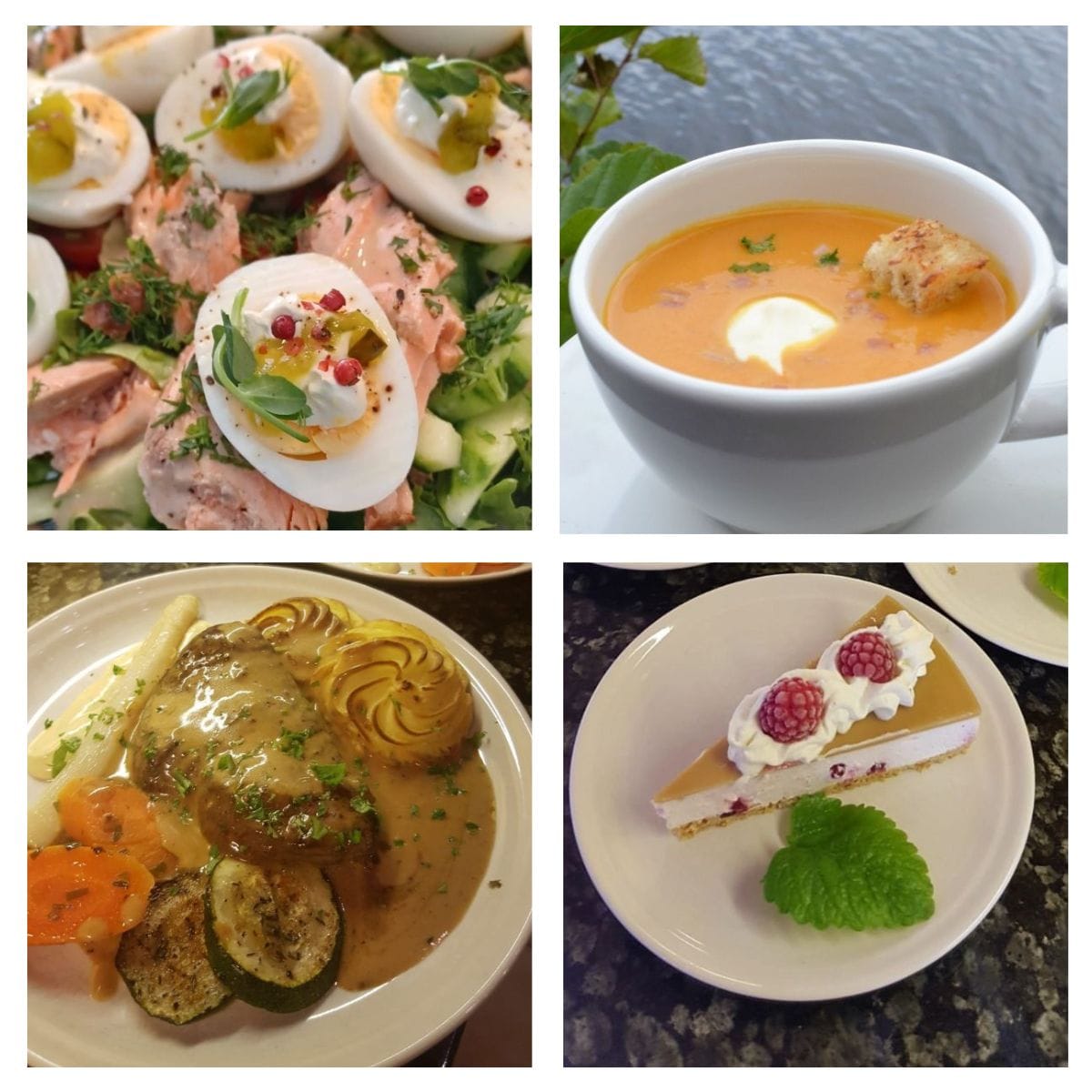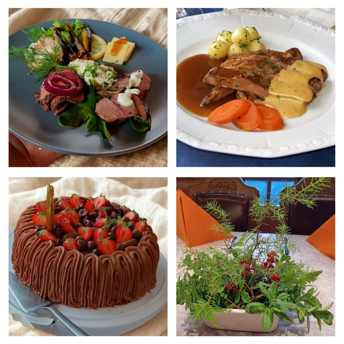 graavilohi, Skagen-alkupala, paahtopaisti, juustot ja hedelmät
